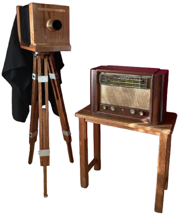 Cámara Vintage: Las fotografías se imprimen al instante en un papel estilo periódico, con un diseño envejecido que recuerda a los periódicos de antaño. Este servicio incluye una radio antigua, que oculta ingeniosamente la impresora, haciendo que la experiencia sea aún más divertida y sorprendente.